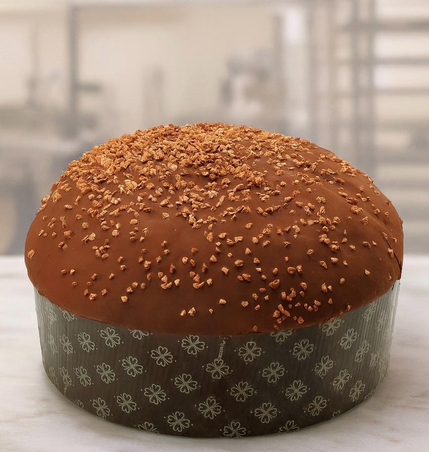 Panettone alla Gianduja ricoperto di cioccolato e nocciole.